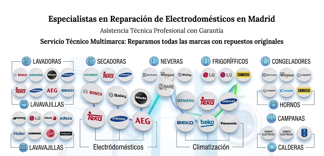 Somos expertos en la reparación multimarca de gran electrodoméstico. Ofrecemos soluciones rápidas y eficaces para sus lavadoras, frigoríficos, lavavajillas y hornos de cualquier fabricante. Al ser un servicio especializado independiente, nos enfocamos en darle una atención personalizada y honesta, trabajando con las principales marcas del mercado para que su hogar nunca se detenga.